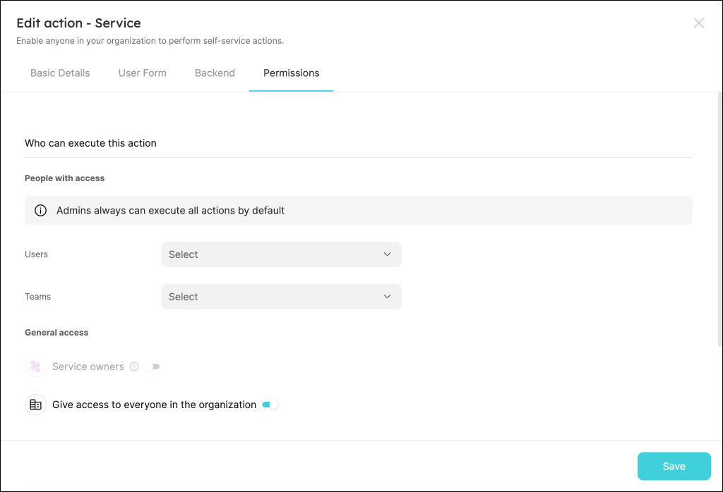 When creating/editing self-service actions, you can set permissions using one of the following methods: