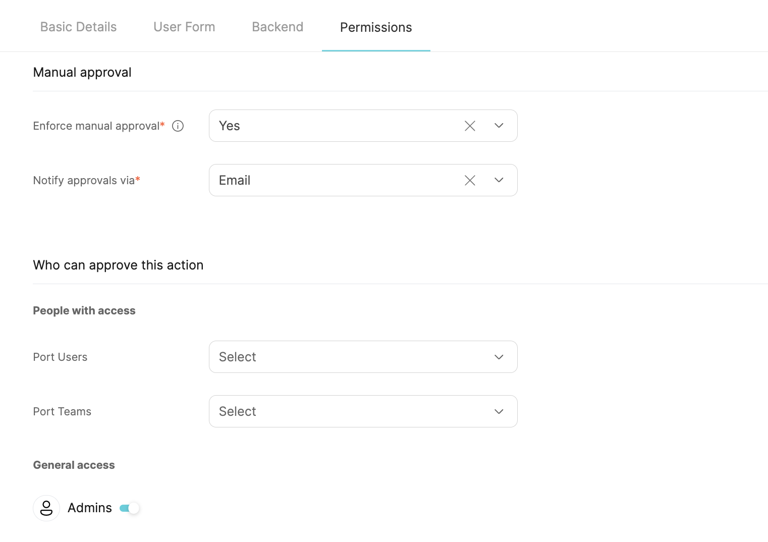 After toggling on the Enforce manual approval option, you can add approvers by selecting them from the relevant dropdown menu (Port Users and/or Port Teams).