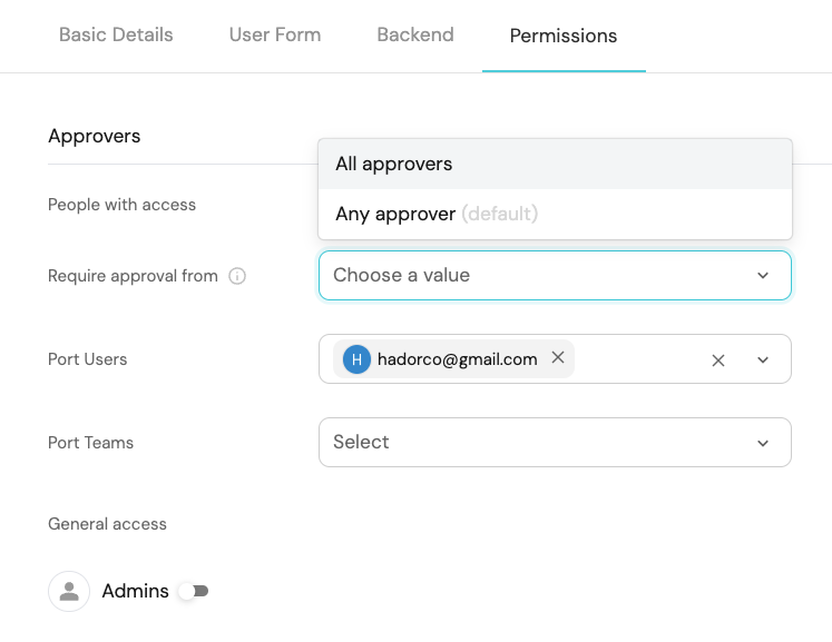 After toggling on the Enforce manual approval option, you can add approvers by selecting them from the relevant dropdown menu (Port Users and/or Port Teams).