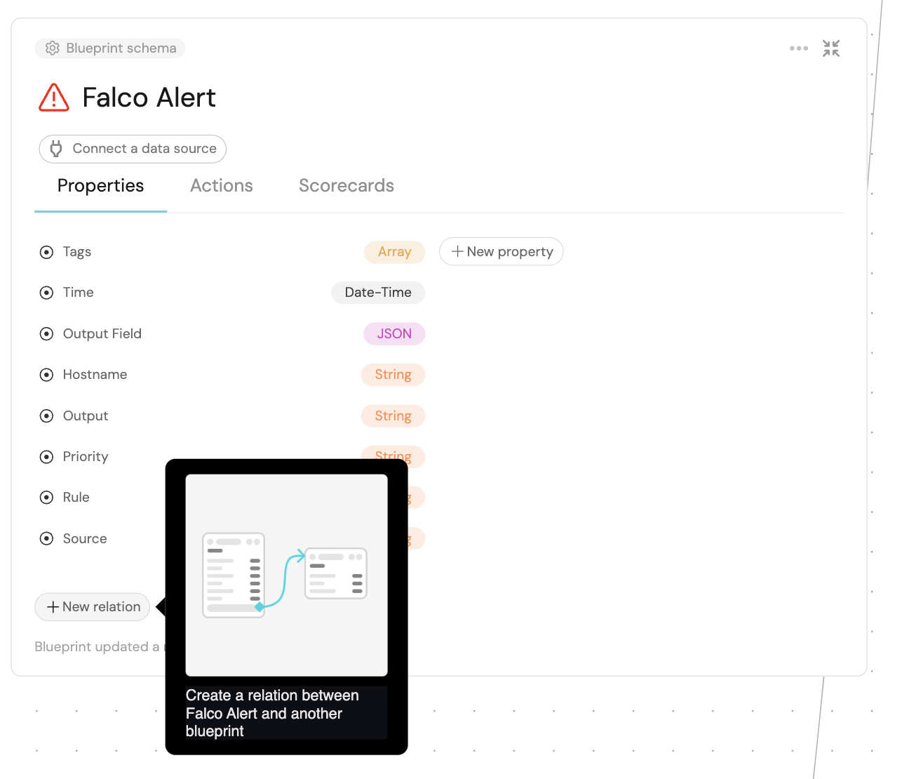 1. Head back to the Builder, choose the Falco Alert blueprint, and click on New relation: