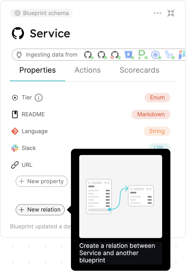 Relations can be used to represent the logical connections between assets in your software catalog, for example: