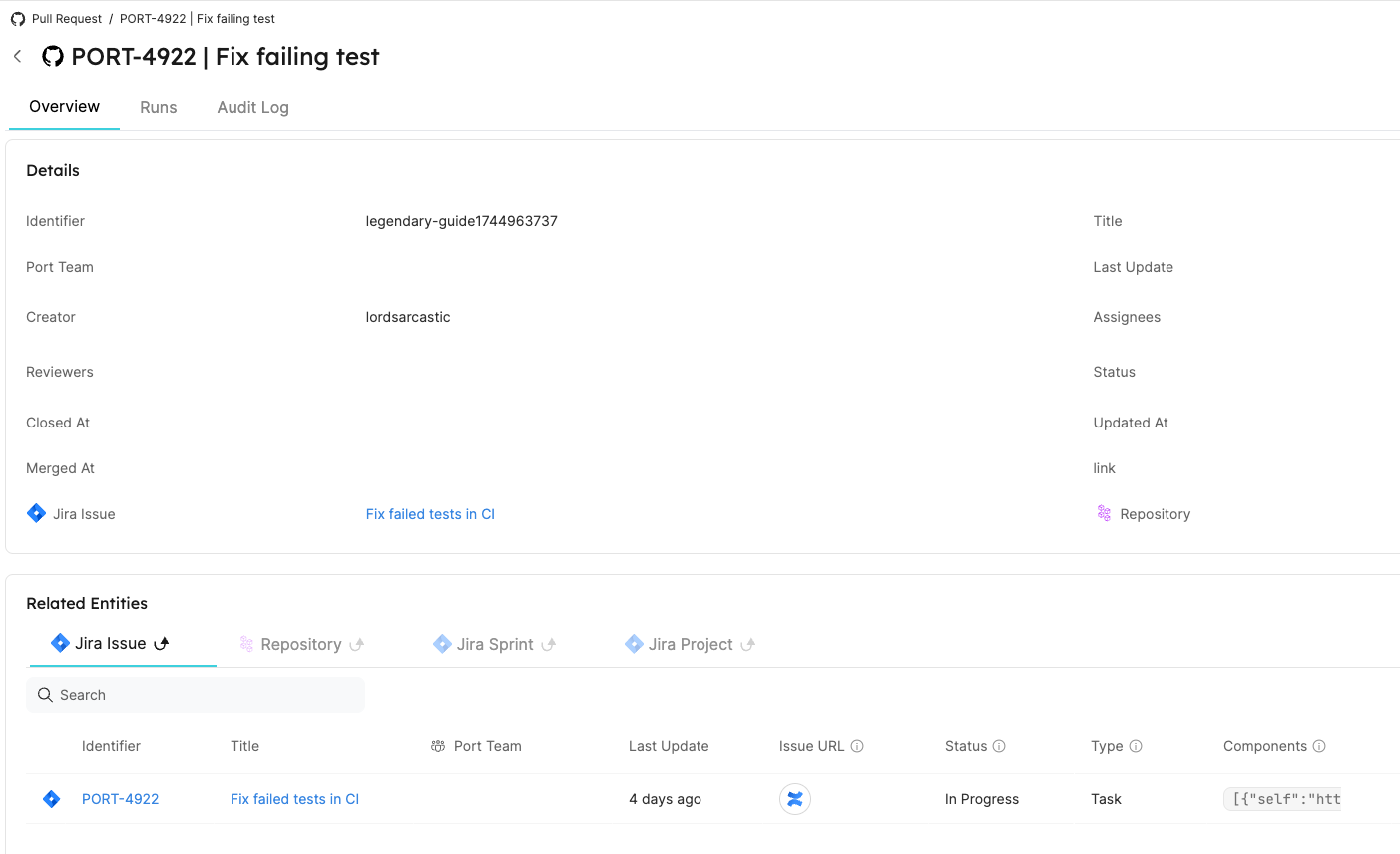 Now that Port is synced with our Jira resources, let's map the Jira issues to the Github pull requests.