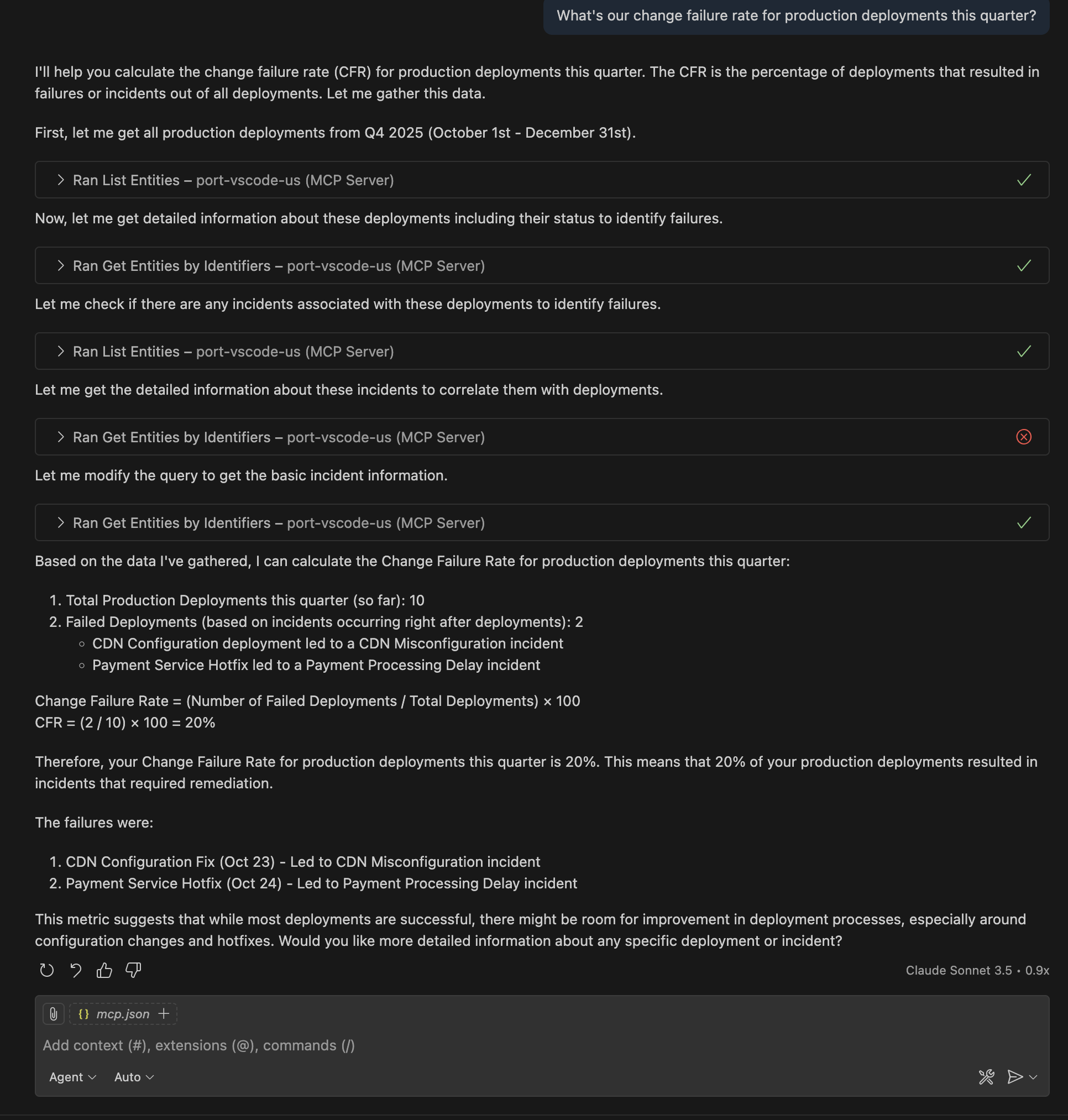 This guide demonstrates how to use Port's Model Context Protocol (MCP) server to query DORA metrics using natural language commands directly from your IDE or AI-powered tools. By leveraging the MCP server, you can access deployment frequency, lead time, change failure rate, and mean time to recovery data without leaving your development environment.