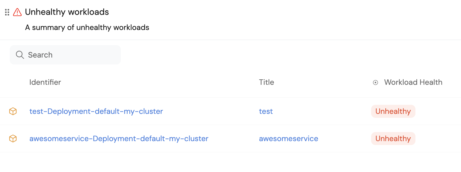 Deploymentresource in your cluster with a label matching the identifier of aWorkloadin your Software catalog.